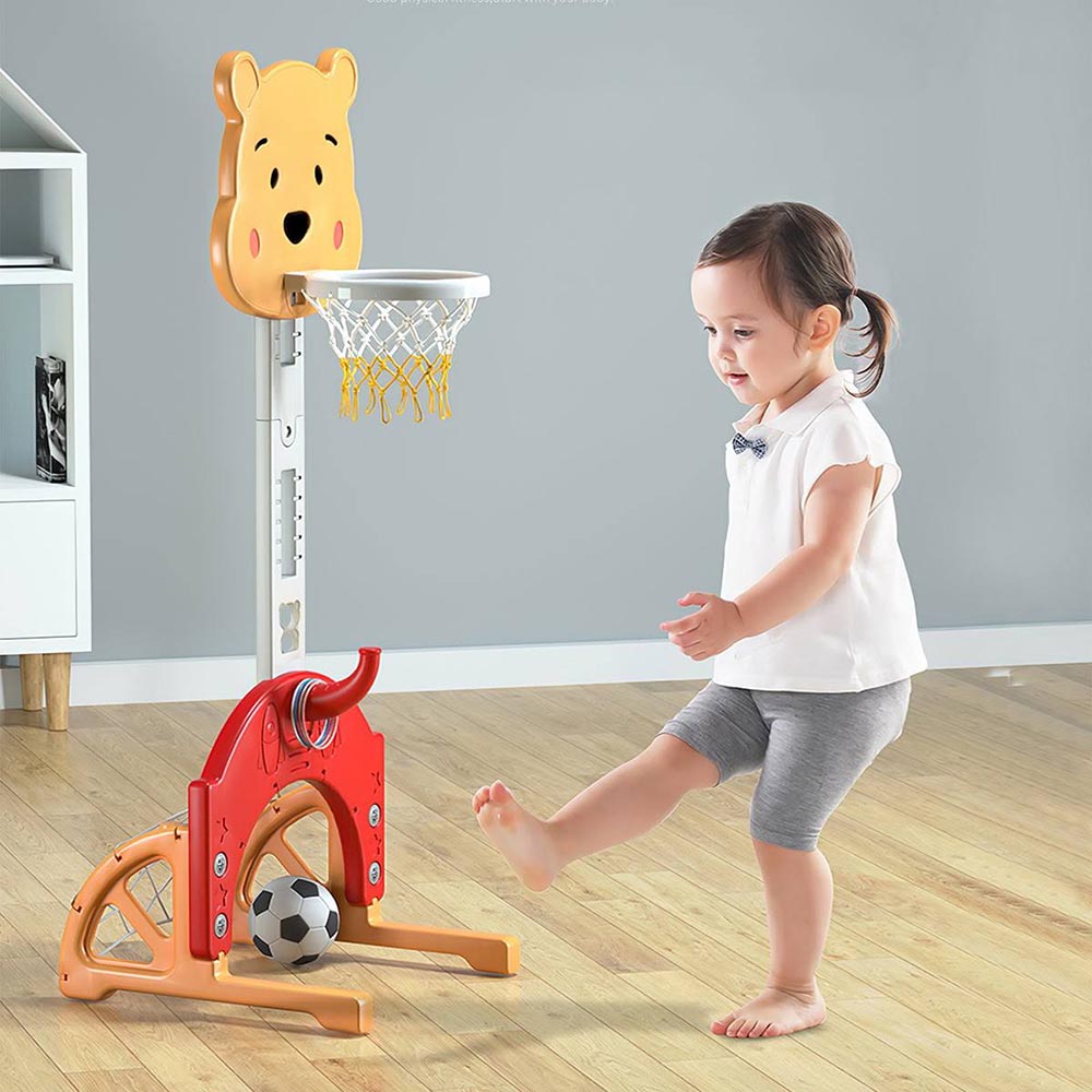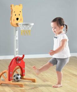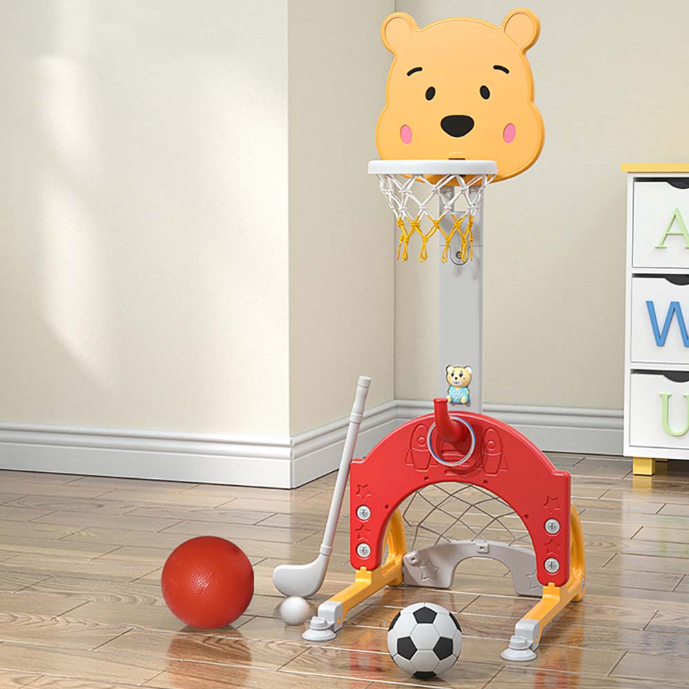 Ez a játékszett négy különböző sporttevékenységet kínál egyetlen állványon. A kosárlabda rész állítható magasságú palánkkal rendelkezik, így a gyermek fejlődéséhez igazítható. A foci kis méretű kapuval van ellátva, amely ideális az első rúgások és célzási technikák elsajátítására. A karikadobás a pontos célzást és a kéz-szem koordinációt fejleszti, míg a golf segíti az alapvető ütési technikák elsajátítását és a koncentráció fejlesztését.