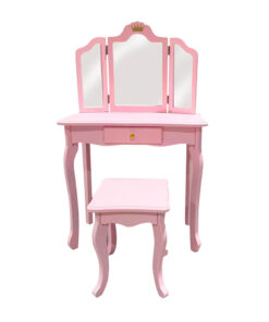 Ez a klasszikus dizájnú, festett fa fésülködő asztal tökéletes játék minden kislány számára, aki hercegnőnek szeretné érezni magát. Behajtható tükrökkel, arany koronával és saját kis székkel felszerelve igazi álombútordarab, mely órákra leköti a gyerekeket szépítkezés és szerepjáték közben.