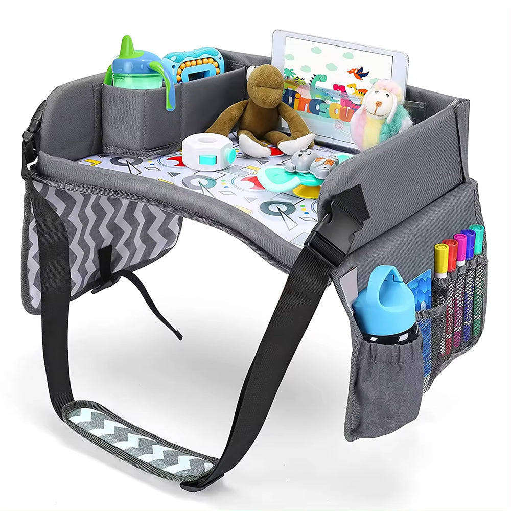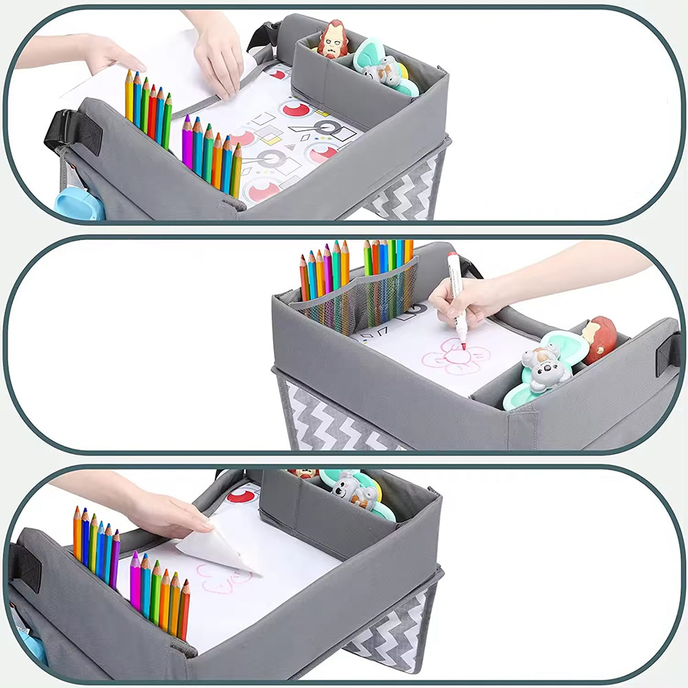 Hosszabb utak során a hordozható gyerekasztal praktikus megoldást nyújt a játékok, rajzeszközök vagy akár egy tablet tárolására. A magas perem megakadályozza, hogy a tárgyak leessenek, így a gyerekek nyugodtan játszhatnak, rajzolhatnak vagy nézhetnek mesét.