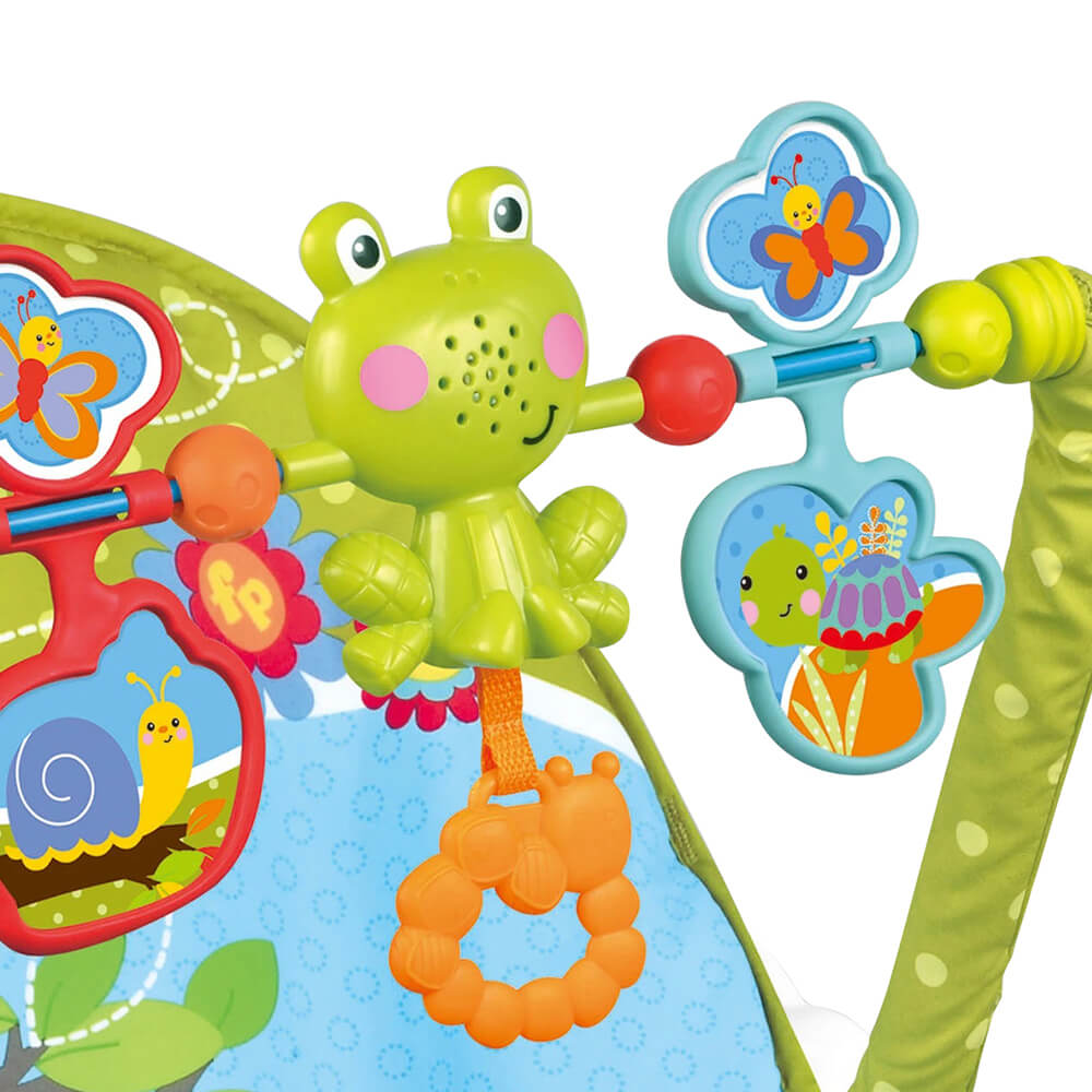 A pihenőszékhez egy aranyos játékhíd tartozik, amely szórakoztató játékokat kínál a babának, serkentve érzékszervi fejlődését és motoros készségeit. A játékhíd magassága kényelmesen elérhető, a színes és kedves figurák pedig szórakoztató játékélményt nyújtanak a kicsiknek.